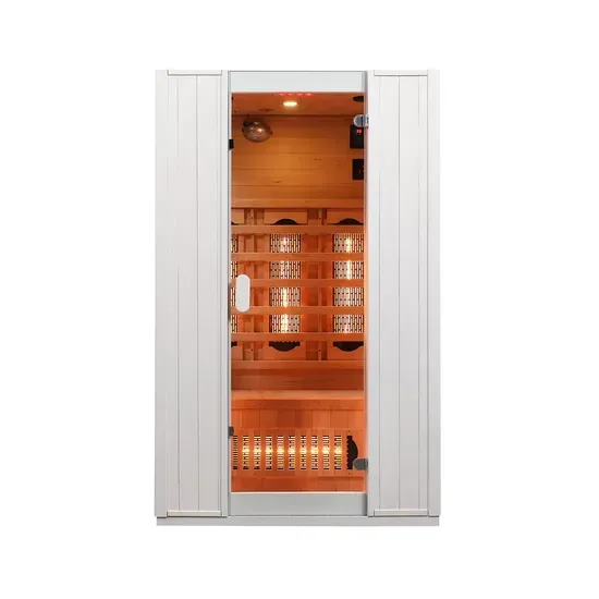 This sauna is designed for two people and offers comfortable seating space for couples or family members.